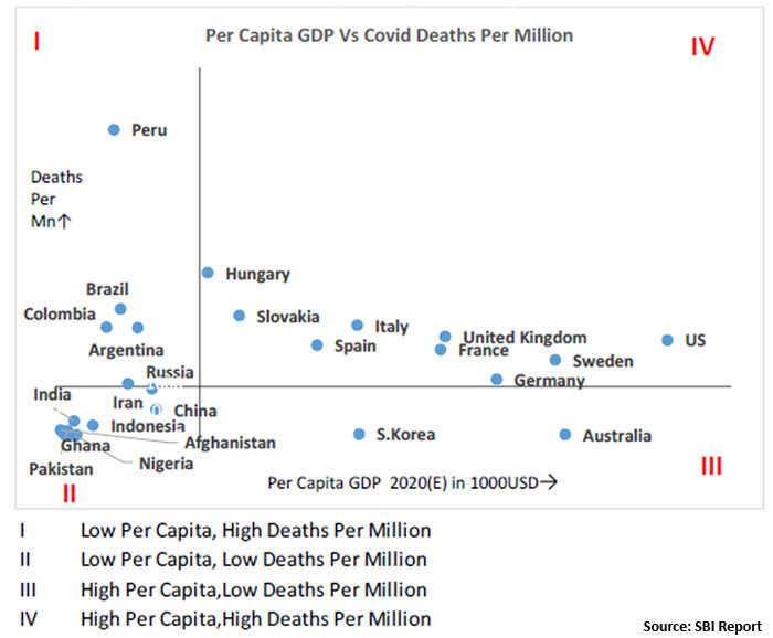 Country-wise data reveals that nations with high per capita GDP have been associated with higher Covid-19 deaths per million.